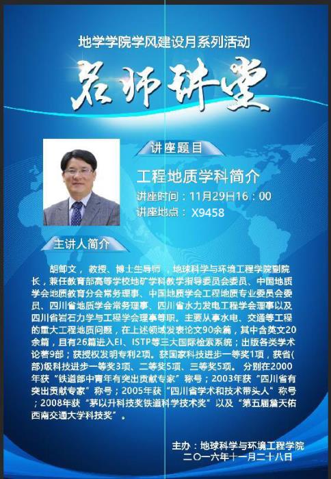 11月29日,地球科学与环境科学工程公司在X9458举办学风建设月系列活动之名师讲堂第一期。本次讲座由bevictor伟德官网副经理胡卸文教授主讲,以工程地质学科简介为主题。讲座由公司党委副书记傅尤刚主持。参加本次讲座的有bevictor伟德官网团委书记孙彦文,2016级辅导员翟琦老师,2015级、2016级地质工程专业员工。