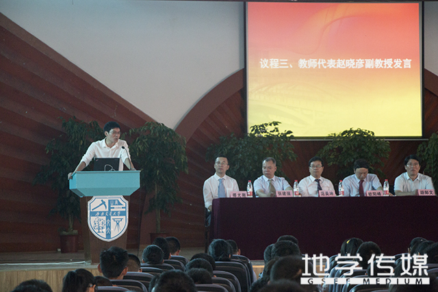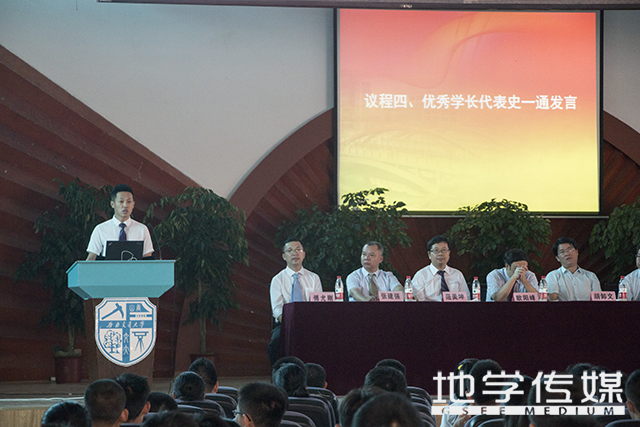 院研究生会主席、2015级安全工程专业史一通作为优秀员工代表发言。他认为无论曾经出于怎样的原因选择了交大,选择了地学,但对于在座的每一位成员来说都是一个新的起点和征程,并提出了合理度过老员工活的几点建议。同时,他以主人翁欢迎大家积极加入员工会、研会,积极参加校内外各项文体活动,努力成长为综合型人才。来自地质四班的新生代表赵聆利同学则谈到了“不忘初心”,提出了科学规划老员工活的四点建议,如“以诚待人,以真会友”、“尊师肯学,持之以恒”、“实践创新、严于律己”等。