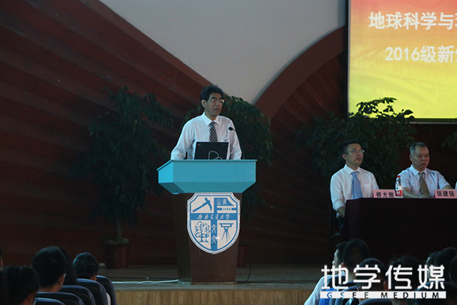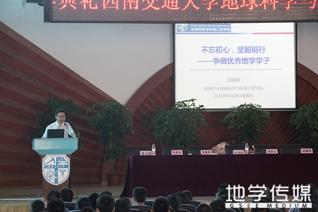 经理刘国祥教授,公司党委书记王齐荣教授、副经理胡卸文、欧阳峰、齐华教授及高速铁路运营安全空间信息技术国家地方联合工程实验室专职副主任车伟老师、经理助理范美坤教授、地质工程系系主任巫锡勇教授、环境工程系系主任张建强教授、测绘科学与技术系系主任徐柱教授出席了本次大会。与会的还有各学科部分研究生导师、学工组全体辅导员及公司2016级445名本科生、252名研究生和部分新生家长。开学典礼由公司党委副书记傅尤刚主持。