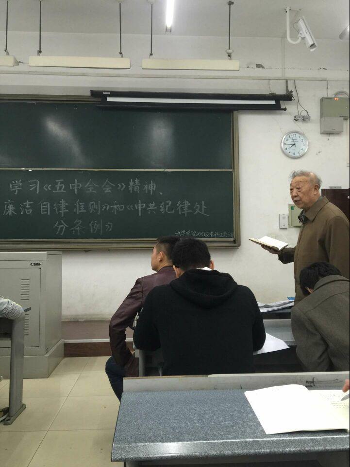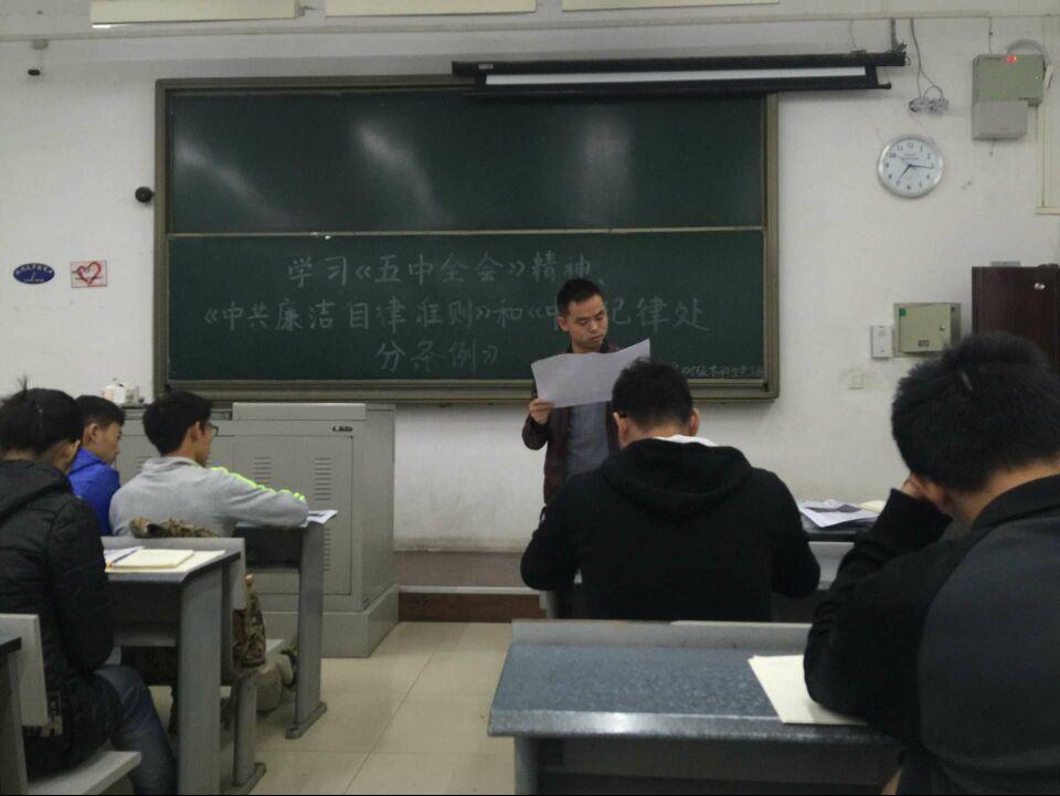 为了让同学们更加了解共产党的政策方针、清正廉洁的重要性及严守纪律的必要性,提高同学们的入党积极性,加深对党执政的认识并培养一名先进共产党员应具备的优秀品质,发挥优秀党员的先锋模范作用。2015年11月10日晚7:00,2015级本科生党支部成员在X7101召开“懂规矩,守纪律”主题活动——学习十八届五中全会精神、《中国共产党廉洁自律准则》和《中国共产党纪律处分条例》。会议邀请到了组织员刘冠军老师,党支部书记孙彦文老师主持会议。