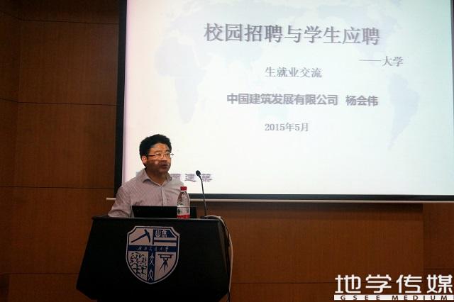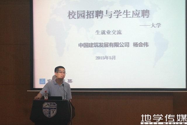 讲座伊始,傅尤刚副书记致欢迎辞,表达了对杨会伟总经理的热烈欢迎,也介绍了在新一季毕业生招聘又将开始的时间节点开展就业指导讲座的重要意义——为老员工就业提供简历制作、面试的经验,助力学子求职就业。其后,杨会伟上台进行经验交流。首先他介绍了其就职的中国建筑发展有限公司的大致情况,其后,他提到了就业压力,2015中国大学毕业生有749万人,就业形势十分严峻。与此同时他分析了现在中国的经济现状,工业回落,投资形势好,诸多高科技行业快速发展,智慧城市风靡全国,走出去、国际化战略进行地如火如荼。但是劣势依然存在,新的经济动力尚未形成,经济增长持续下行,“房地产化”经济难以快速扭转。