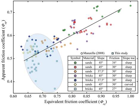 (3)发现了实验室尺度下滑坡碎屑化运动形成的等效摩擦系数Φeq (Equivalent friction coefficient)与表观摩擦系数Φap(Apparent friction coefficient)的负相关关系(图4),由此可以说明:滑坡的动力破碎过程显著抑制了其整体的运动性,然而动力破碎这一力学过程可以有效促进滑体前缘的运动,作者认为这一现象是块体破碎的弹性应变能释放效应所致。