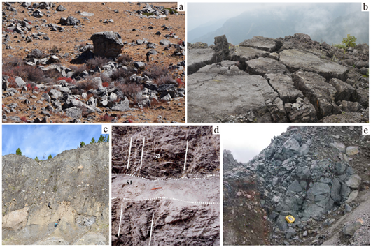 程谦恭教授团队近几年来针对青藏高原高速远程滑坡呈现的动力破碎现象与特征进行了深入的调查研究,在野外定量测量与分析了青藏高原地区典型高速远程滑坡(易贡滑坡、乱石包滑坡、尼续村滑坡、塔合曼滑坡等)堆积体岩体碎裂结构特征(图1)。在此基础上,林棋文博士进行了滑坡碎屑化过程大型物理模型实验,利用高速摄影系统和倾斜摄影测量技术获取滑坡碎屑化运动过程参数与堆积特征,分析不同源区岩体结构背景下滑坡的碎屑化运动机理。取得的主要认识如下: