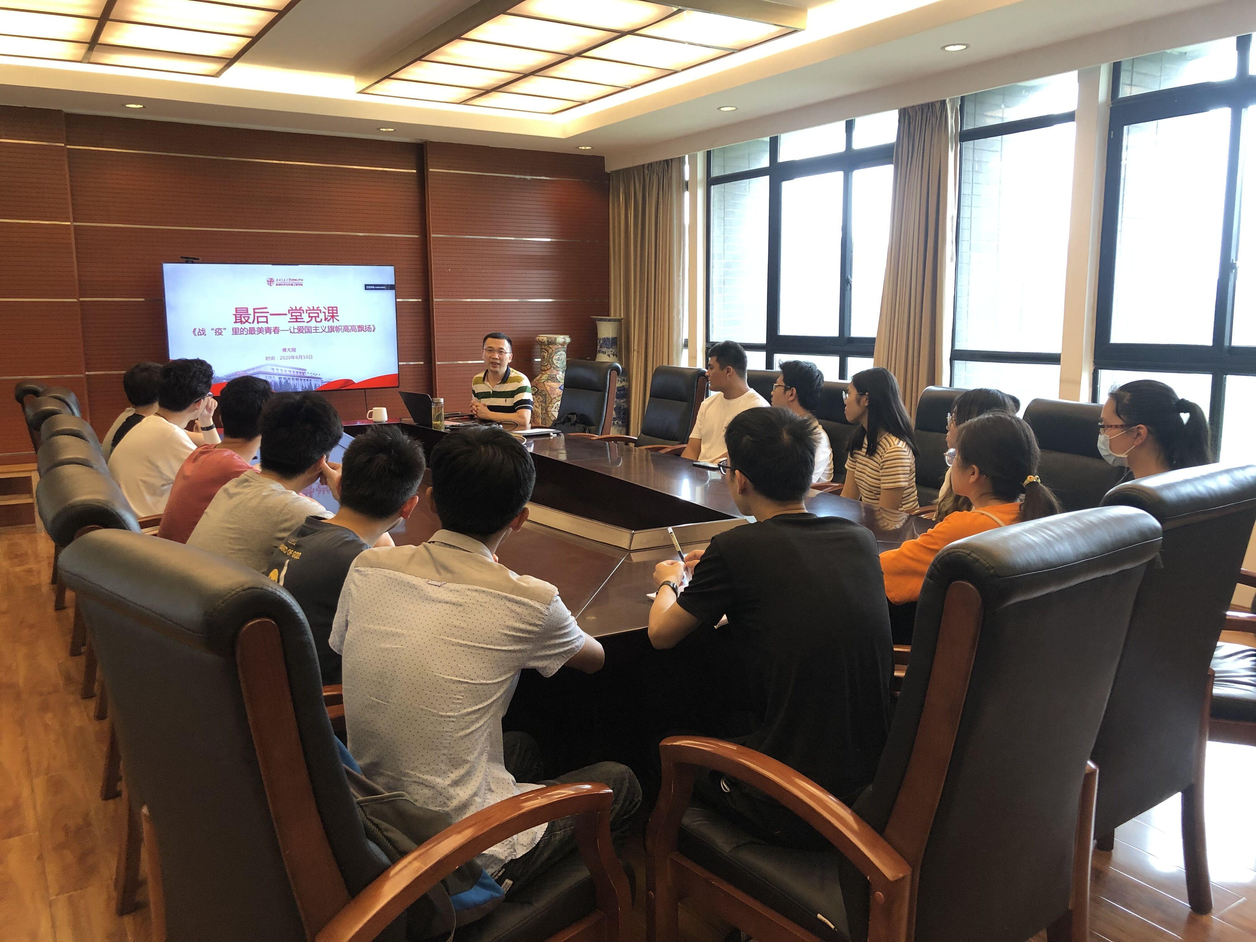 6月10日下午,公司党委副书记傅尤刚以“战疫里的最美青春—让爱国主义旗帜高高飘扬”为题,通过线上线下联动的方式为2020届毕业生做“建功立业新时代”——职前价值塑造班会,其中本16级党支部在X4531线下参与,其余毕业生通过腾讯会议线上参与班会。