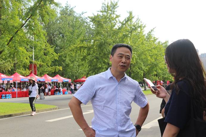 公司党委副书记傅尤刚在往返于九里和犀浦的迎新点,关注迎新工作,在现场询问迎新工作进展以及新生入学办理情况。他与迎新工作者亲切交谈,叮嘱大家在迎新的同时不要忘记认真复习期末考试。他特别感谢志愿者们为迎新生提供的贴心周到服务,为新生报到提供了很多便利。