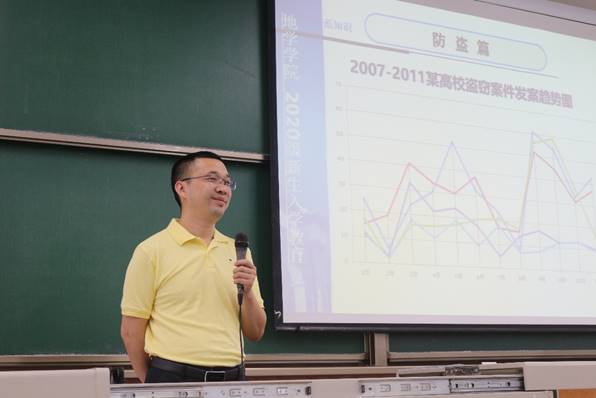 傅尤刚在安全教育开始前与同学们进行了亲切的交谈,他嘱咐大家要继续关注疫情,自觉佩戴口罩和保持一定距离,降低疫情传播风险。随后,他按照大学进行安全教育的客观要求,即大学环境、社会发展、社会法制建设和经济发展这三个要求,一一为同学们细致讲解。其中,他在讲解防盗、防骗、防人身伤害、交通安全、防火安全和防震安全六个方面的安全知识时,通过大量的图片和数据,详细直观地告诉同学们老员工活中安全防范的重要性。他告诫同学们要修身律己、遵纪守法,同时也要时刻保持警惕、关注安全,不让违法分子有可乘之机。