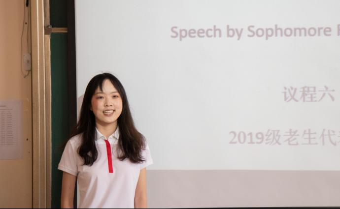 老生代表蒋玉佳也向新生们表示祝贺并提出三点建议:一是重视雅思等课程的学习,提升英语水平。二是丰富业余生活,鼓励新生们参加社团活动。三是遇到困难需要咨询时,应及时向老师和学长学姐求助。