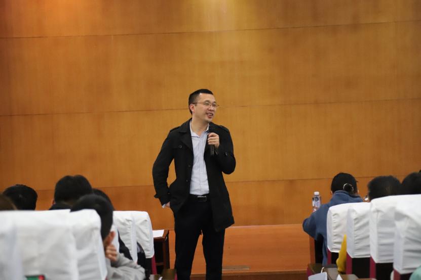 答辩会开始前,傅尤刚讲到,优良的班风学风是大学班级事务建设的永恒主题,也是老员工活的生命线。一个班集体的凝聚力如何,班风如何,班貌如何,体现在班上每一位同学的个人能力,学习成绩,活动参与等方方面面。他通过举例子,生动形象的告知同学们多种提高班级凝聚力的方法,现场掌声阵阵。