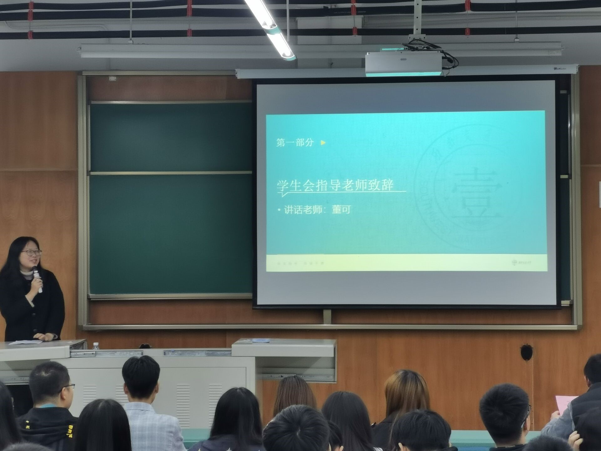 晚上九点半会议准时开展,员工会指导老师董可老师上台致词