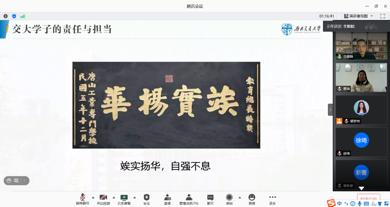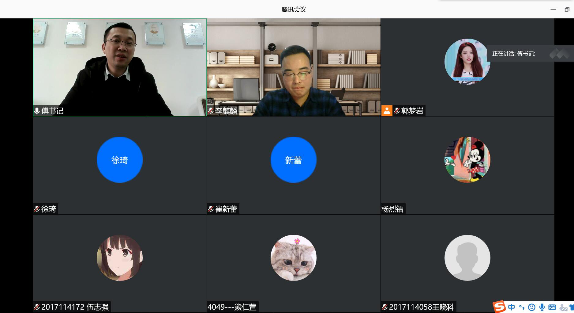 本次党日活动采用视频会议的方式在线上进行。首先,傅尤刚从当下疫情防控进入关键时刻,党员的角色的担当引入,要求党员干部以身作则,做到不恐慌、不信谣、不传谣,坚定政治立场,发挥员工党员的主心骨和模范带头作用。通过全国劳动模范孟祥连的故事,讲述优秀院友苦学专业知识,在实践中练就专业技能,在新时代建功立业,奋斗在祖国最需要的地方,勉励党员同学寻学长经验,能之苦肯转眼,脚踏实地奋斗在祖国需要的地方。最后傅尤刚希望党员同学都能梳理远大理想,将所学知识用到攻克国家发展难题之中,将个人的需要与祖国的需要结合起来,牢记党员使命,为国奋斗洒青春。