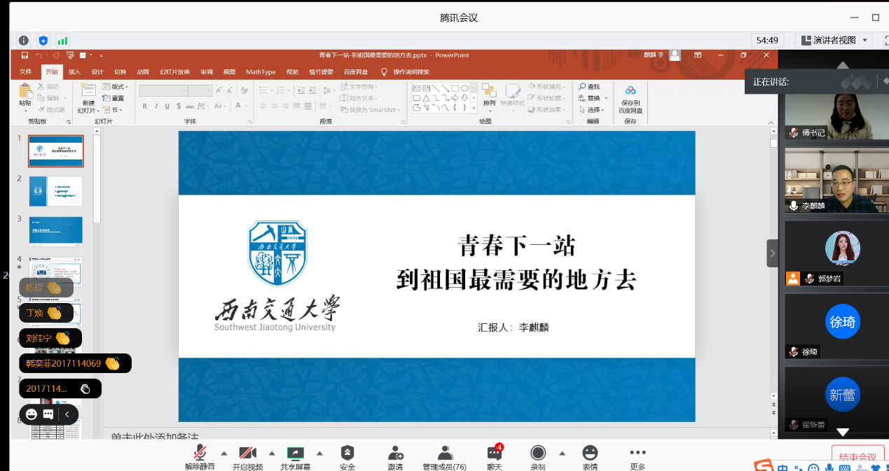 12月10日下午,bevictor伟德官网本2017级联合党支部线上开展“不忘初心 不负韶华——青春下一站,到祖国需要的地方去”主题党日活动,党支部组织员公司党委副书记傅尤刚主讲,校基层就业先进个人、研究生支教团成员李麒麟作分享。本2017级联合党支部全体党员同志、发展对象、积极分子参加活动。党支部指导老师本2017级辅导员翟琦主持。