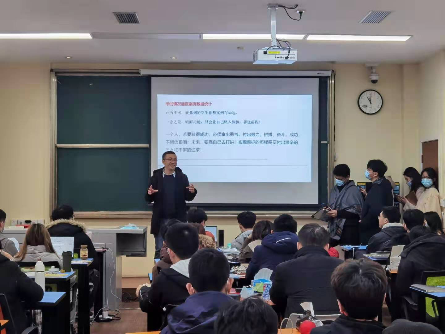 接着,傅尤刚通过列举考试情况通报案例和相关数据统计,叮嘱同学们诚信考试,不要因为一念之差做出错误的行为。表示实现目标的历程需要付出艰辛的汗水和不懈的追求,选择正确的道路,脚踏实地一直走下去,作为老员工在期末考试中要做到积极备考,自信临考,诚信应考!