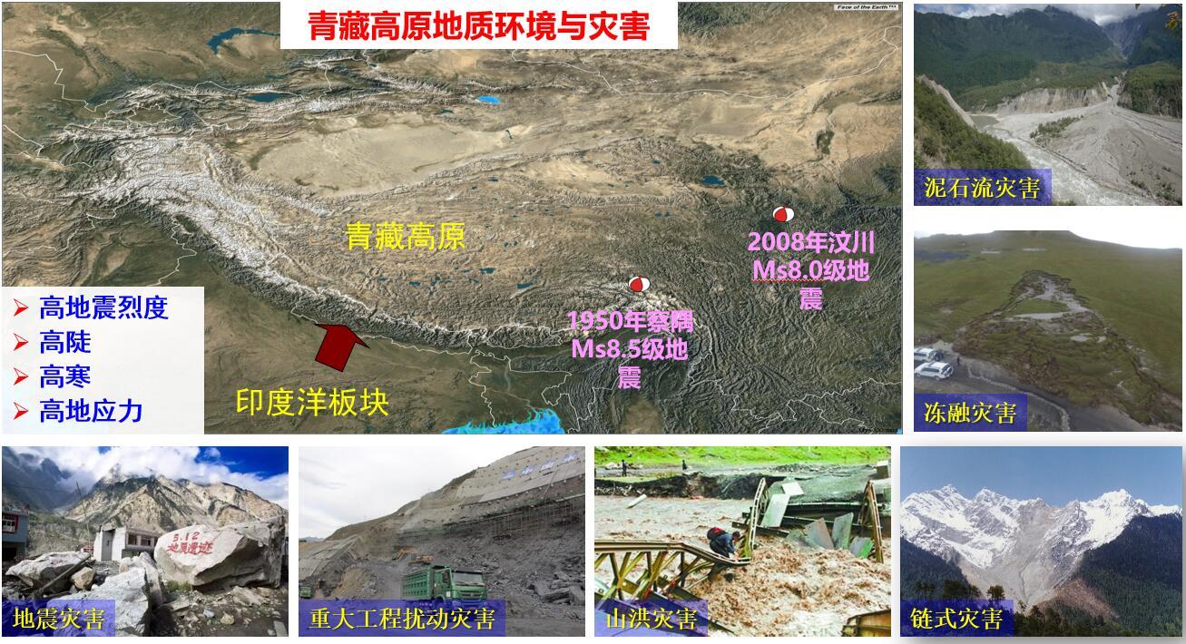 青藏高原是中国最大、世界海拔最高的高原,被称为“世界屋脊”、“第三极”。青藏高原地质环境具有高地震烈度、高陡、高寒、高地应力等“四高”特征(图1)。在此背景下,青藏高原是地震、崩塌、滑坡、泥石流、冰湖溃决等多种自然灾害并发及多发区,且灾害链生性显著,一直为科学界所瞩目,成为国际上地球科学暨工程地质领域的研究热点和关键区域。