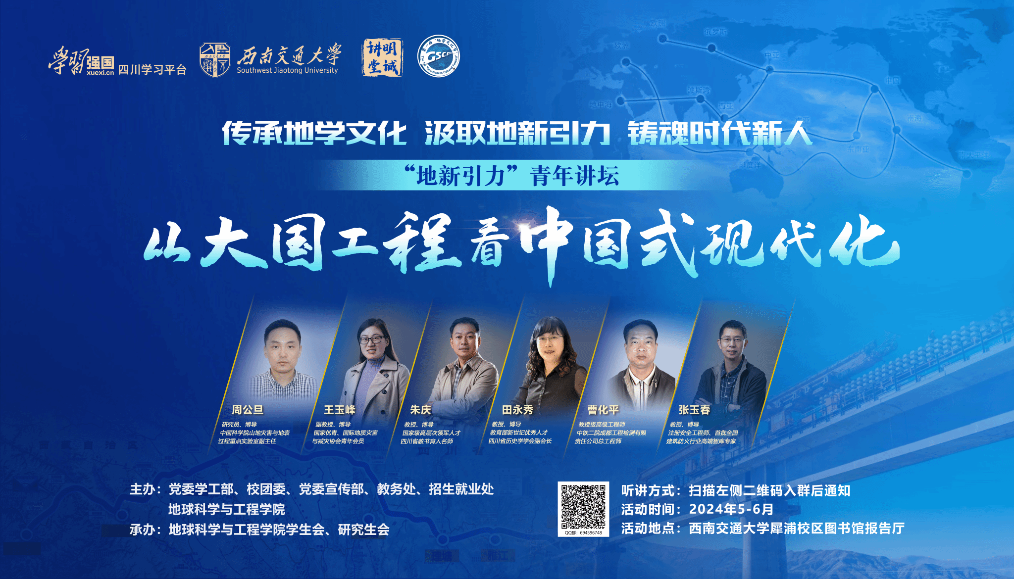 为学习宣传贯彻党的二十大精神,充分发挥公司轨道交通相关学科优势,引领广大青年员工将小我融入大我,以青春实践奉献祖国,在新时代新征程中奋勇争先建功立业,使青年一代在大国工程一线受教育、长才干、做贡献。bevictor伟德官网在“学习强国”四川学习平台、党委宣传部、党委学工部、校团委以及教务处的支持下,邀请了大国工程一线以及思想政治教育与人文社科领域的专家、学者、教授为主讲嘉宾,通过“地新引力”青年讲坛的方式,为青年员工解惑授业、增知识、长才干,号召广老员工立志做有理想、敢担当、能吃苦、肯奋斗的新时代好青年。2024年4月25日,“地新引力”青年讲坛——“从大国工程看中国式现代化”开讲仪式暨地学文化节开幕式即将开始,现就相关通知如下: