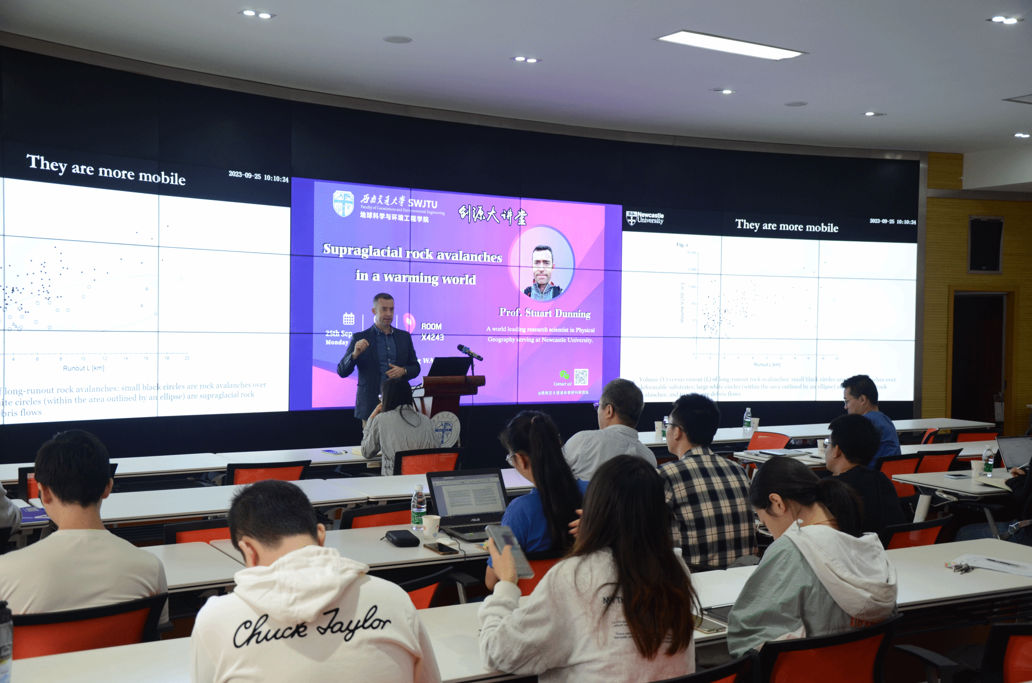 为推动国际化示范公司建设,开阔师生学术视野,提高公司研究生和本科生的科研和创新能力,进一步营造良好的学术氛围,2023年9月25日上午,受公司程谦恭教授团队邀请,世界地质灾害领域著名学者Stuart Dunning教授来访公司,在犀浦校区X4243会议室开展学术报告。Dunning教授现任职于纽卡斯尔大学(Newcastle University),其研究涉及高速远程滑坡沉积学与动力学、冰湖溃决洪水灾害链、地貌演化与沉积物迁移等领域,并在Nature Communication、Geology、Earth and Planetary Science Letters、Landslides等国际著名期刊发表超过50篇高水平论文,在国际学术界享有盛誉。